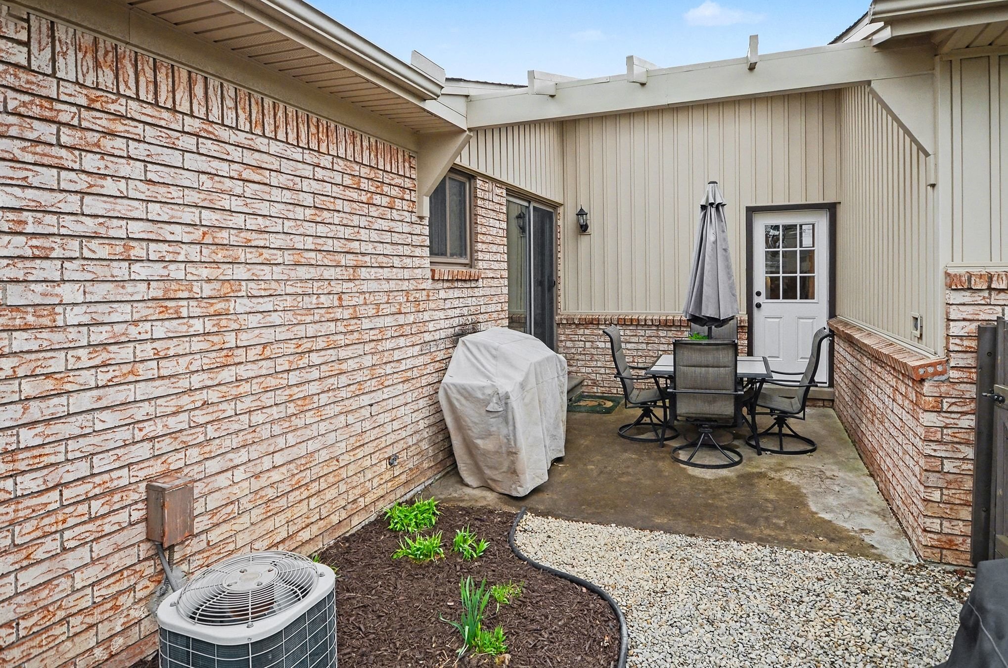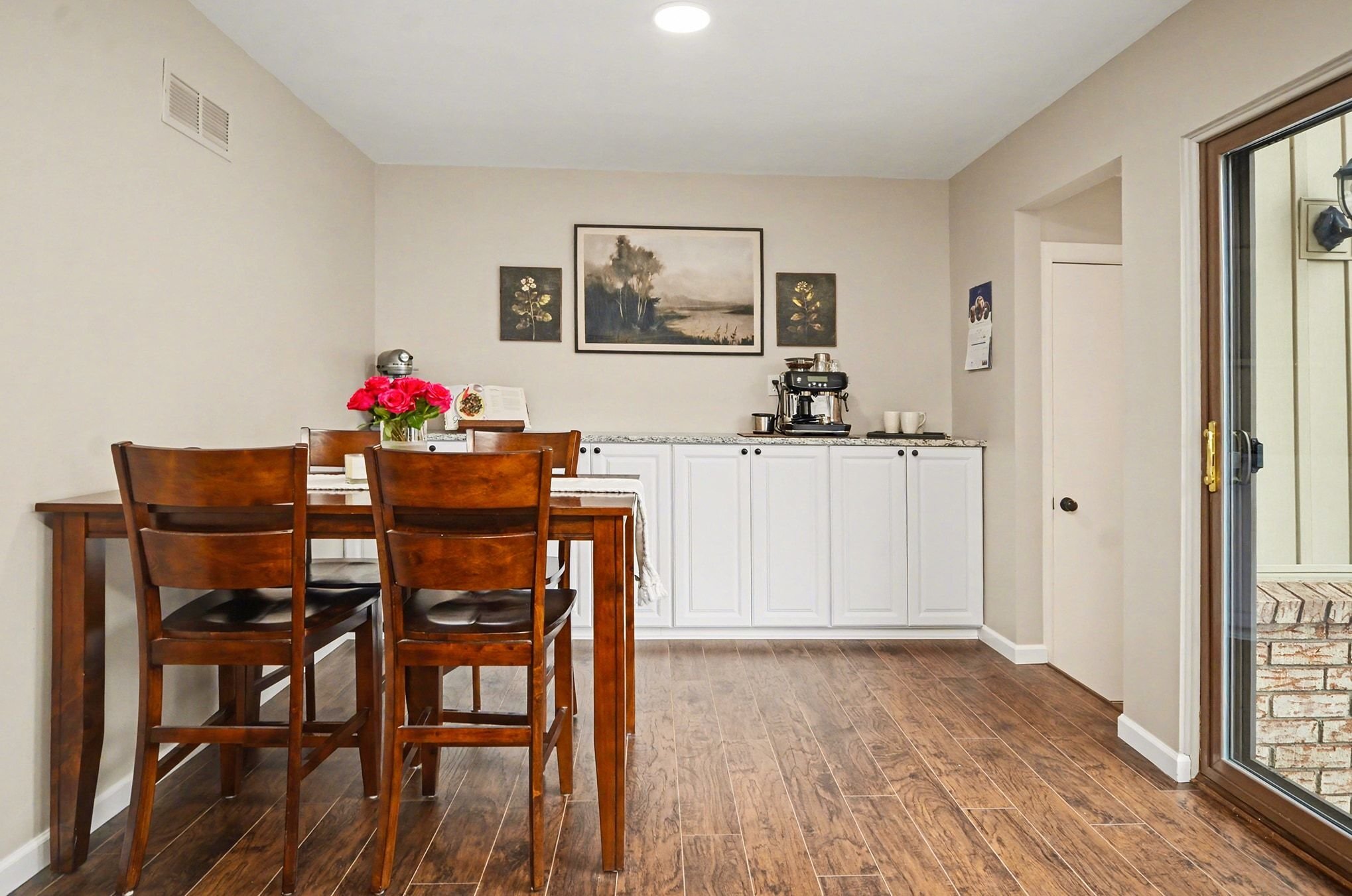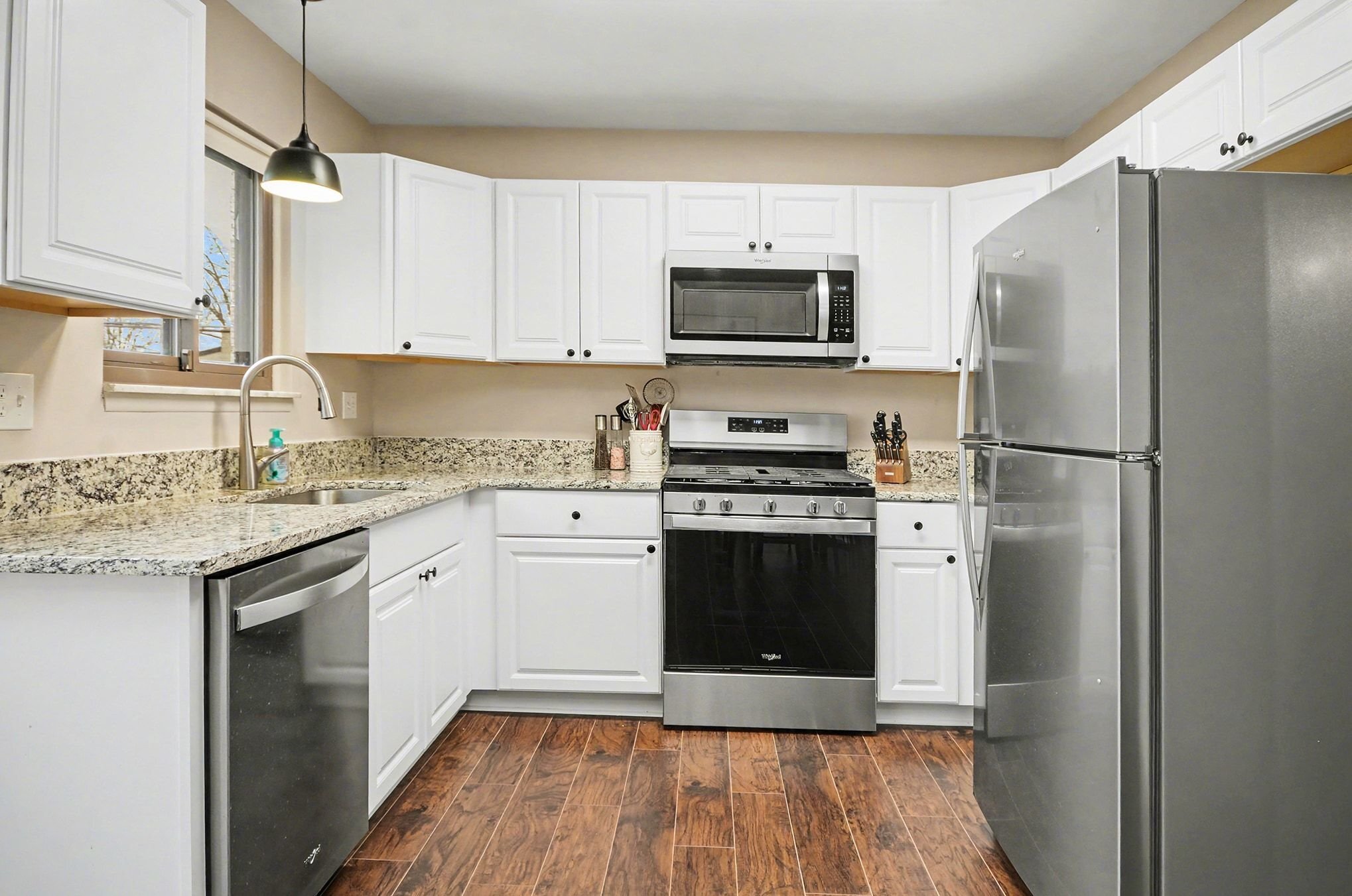 The living room is anchored by warm wood floors and a wide picture window that pulls in natural light throughout the day with a softer, more relaxed feel in the evenings. The dining area connects easily to the brand-new kitchen, where everyday life tends to gather. Gorgeous shaker cabinets, granite counters, a new stainless-steel suite of appliances, and an extended coffee bar along the far wall doubles as a serving buffet when you have friends over. The door wall leads out to the secluded patio area and spacious yard, offering privacy for grilling, letting a pet out, or simply lounging in the fresh air. A convenient half bath sits adjacent to the attached garage access and a second patio entry.