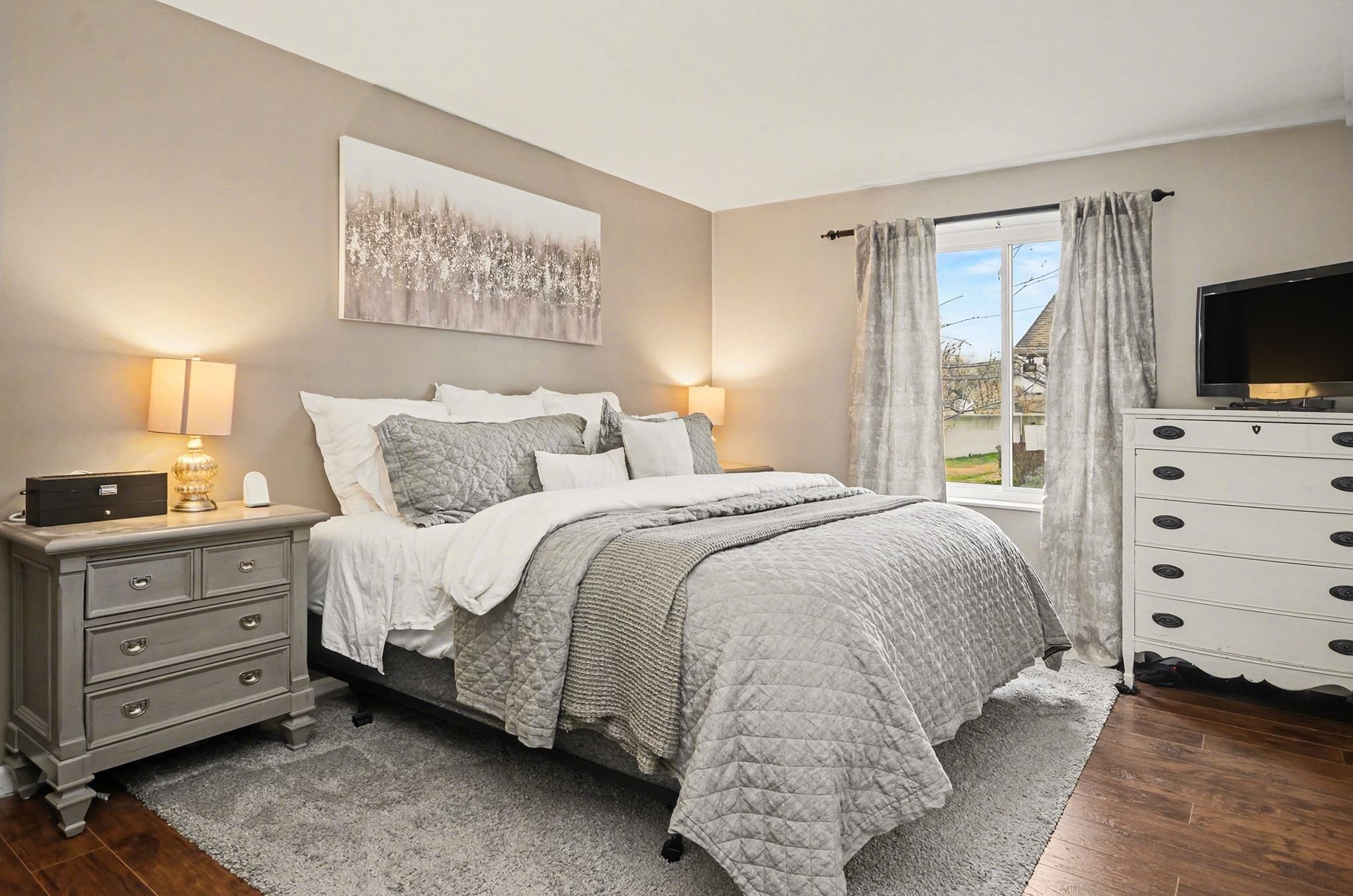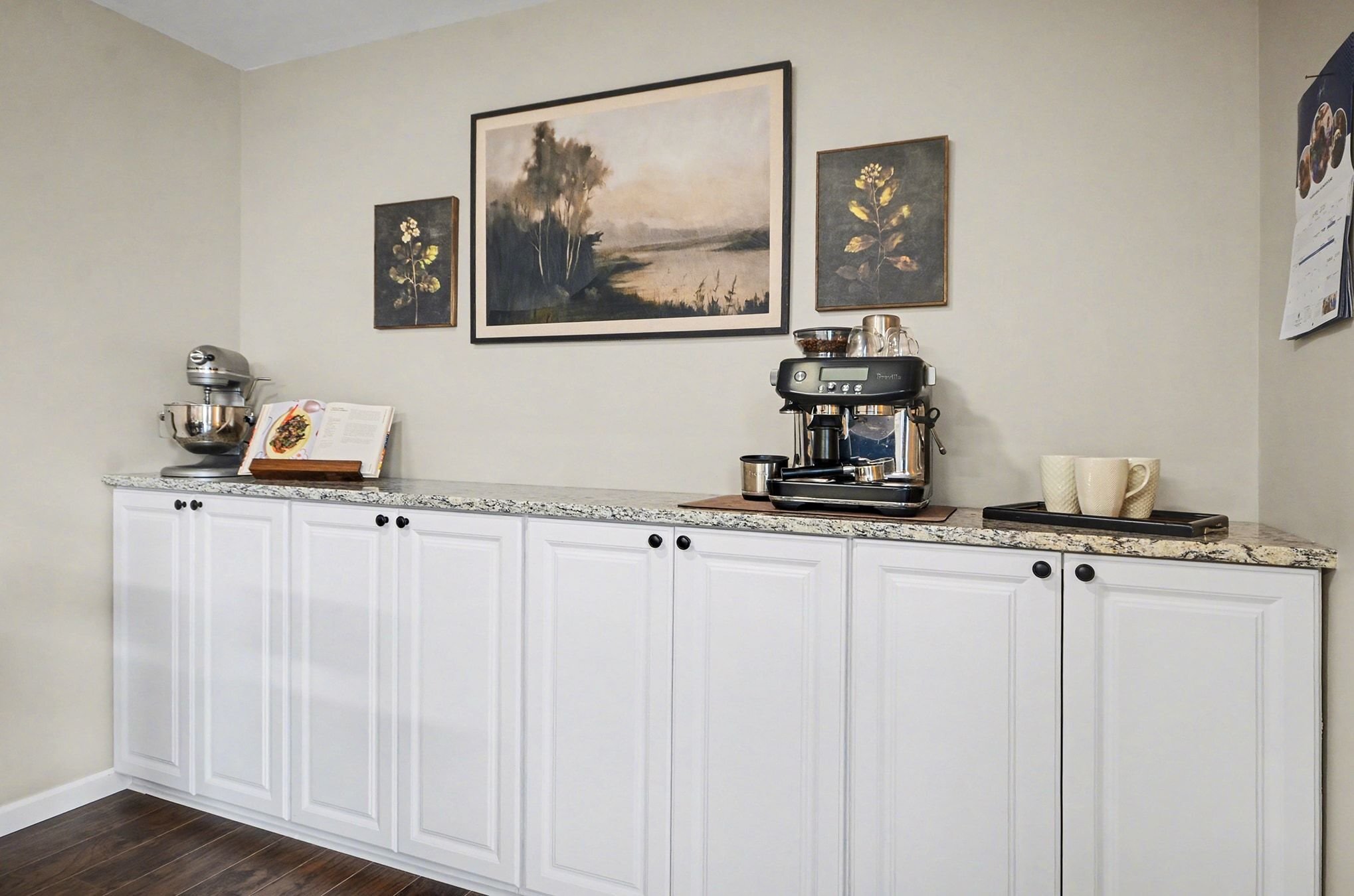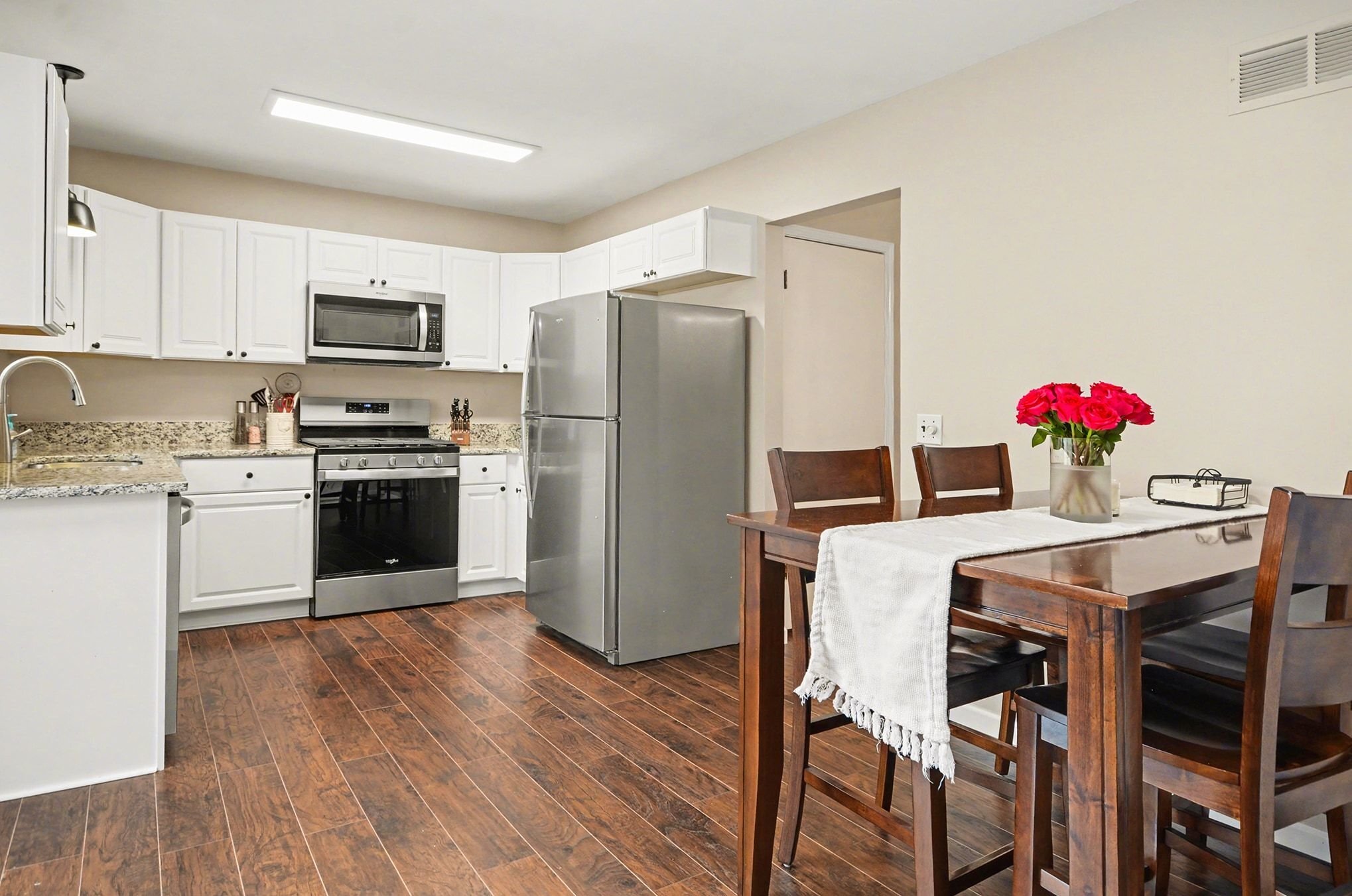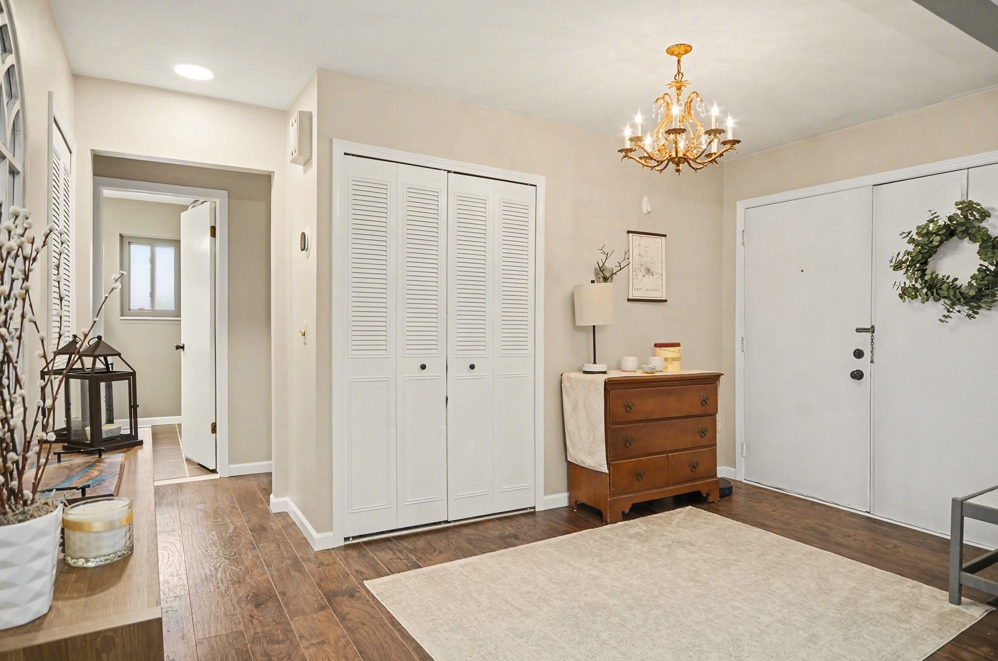 The living room is anchored by warm wood floors and a wide picture window that pulls in natural light throughout the day with a softer, more relaxed feel in the evenings. The dining area connects easily to the brand-new kitchen, where everyday life tends to gather. Gorgeous shaker cabinets, granite counters, a new stainless-steel suite of appliances, and an extended coffee bar along the far wall doubles as a serving buffet when you have friends over. The door wall leads out to the secluded patio area and spacious yard, offering privacy for grilling, letting a pet out, or simply lounging in the fresh air. A convenient half bath sits adjacent to the attached garage access and a second patio entry.