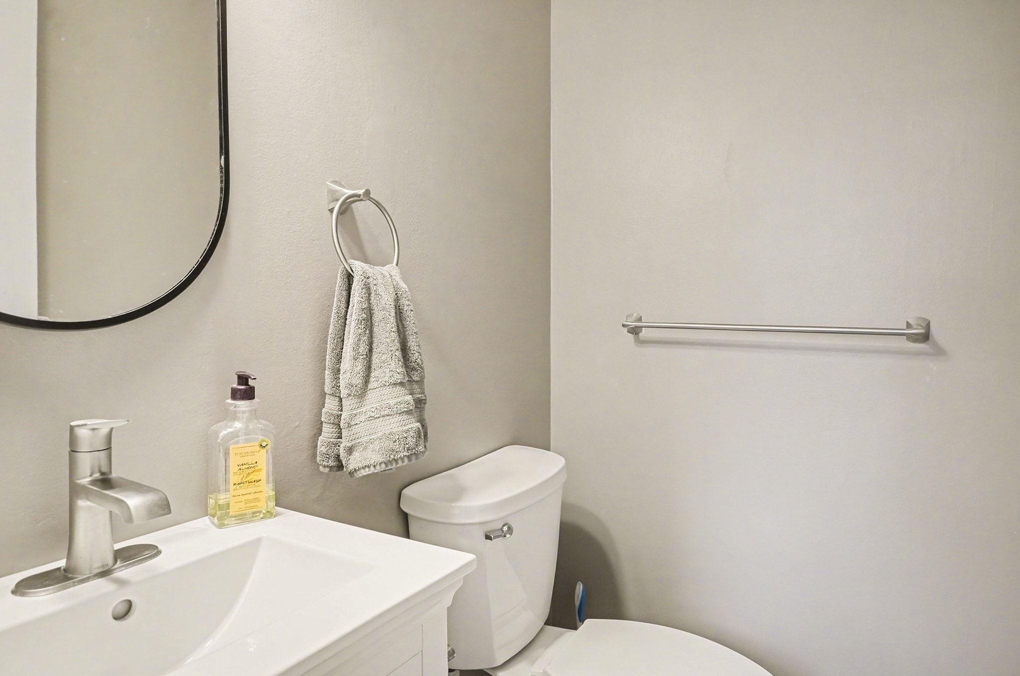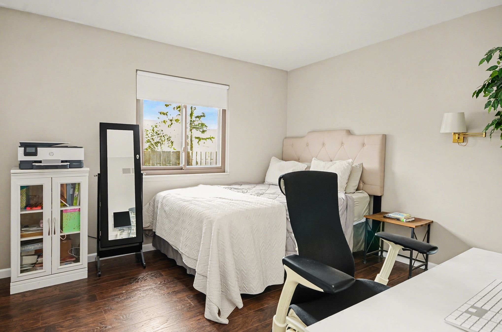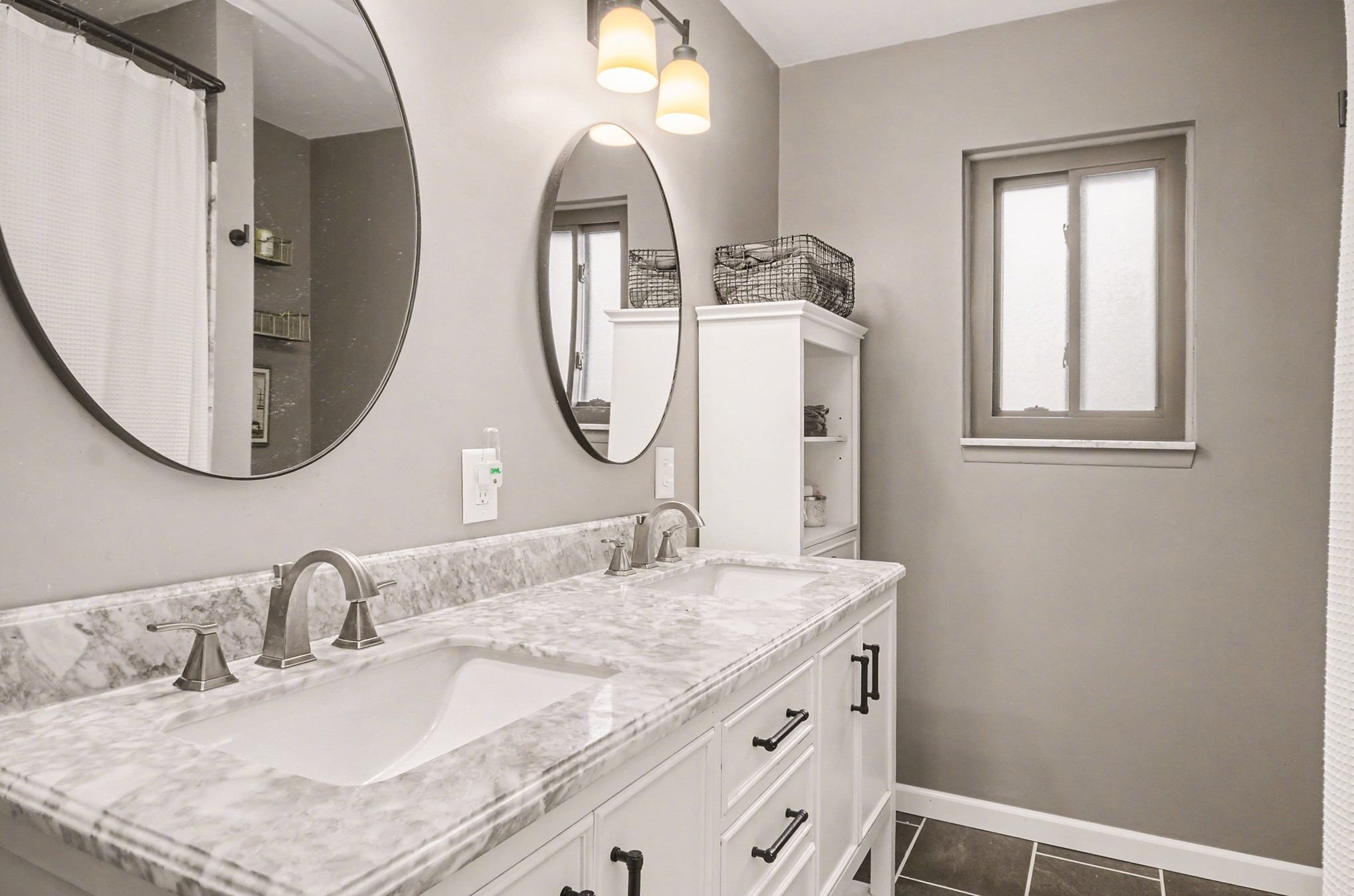 Down the hall, both bedrooms are set aside toward the back of the home, flanking the modern full bath, each with generous closet space and offering a quieter, more secluded space away from the main living areas. The primary bedroom, in particular, has a calm, tucked-away presence. The full bath has been updated with a stone dual-sink vanity, ceramic tile flooring, new fixtures, and a modern color palette.